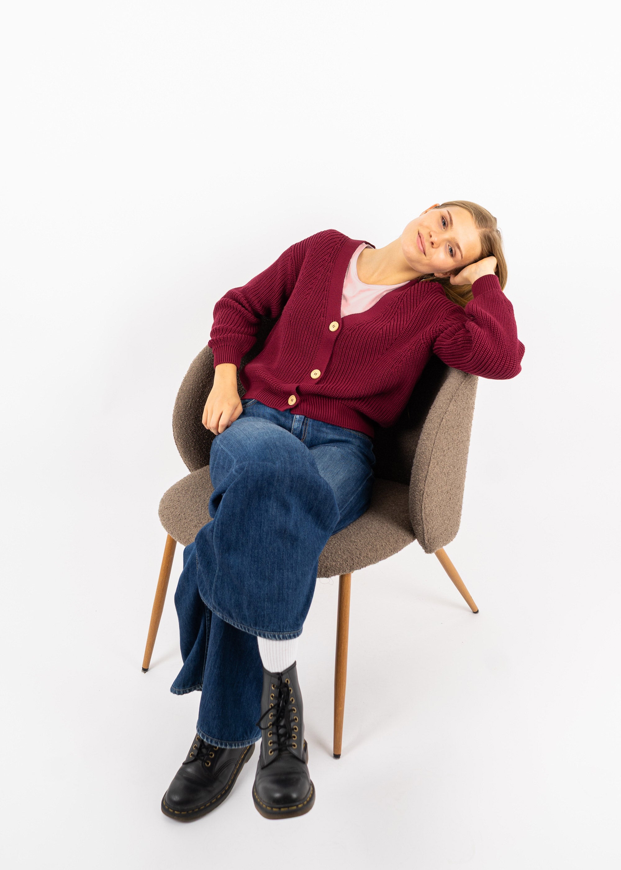 Die Strickjacke ANNALOTTA in CabernetRed setzt den idealen Kontrast dazu. Ihr klassischer Schnitt, die Holzknöpfe und das weiche Baumwollgarn machen sie zu einem Lieblingsstück für jeden Tag. Über dem Longsleeve getragen entsteht ein Look, der Wärme ausstrahlt und gleichzeitig frisch und modern wirkt.